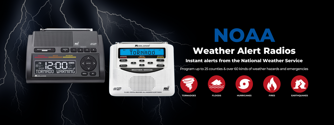 The gold standard of NOAA Weather Radios. The Midland WR120 NOAA Weather Alert Radio features S.A.M.E. EZ localized programming and alerts you to over 60 kinds of weather hazards and emergencies. When a severe weather watch or warning is issued by the National Weather Service, the WR120 emergency weather alert radio automatically alerts you, giving you the seconds you need to seek shelter.